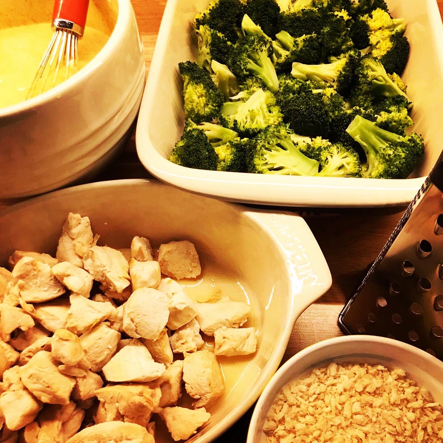 Place the blanched broccoli in the baking dish followed by the chicken pieces, then spread the sauce on top covering all the broccoli and chicken them sprinkle over the grated cheddar cheese followed by the panko breadcrumbs. Place on a baking tray and cook on the lower shelf of the preheated oven for 45 – 50 minutes until golden brown and bubbling.