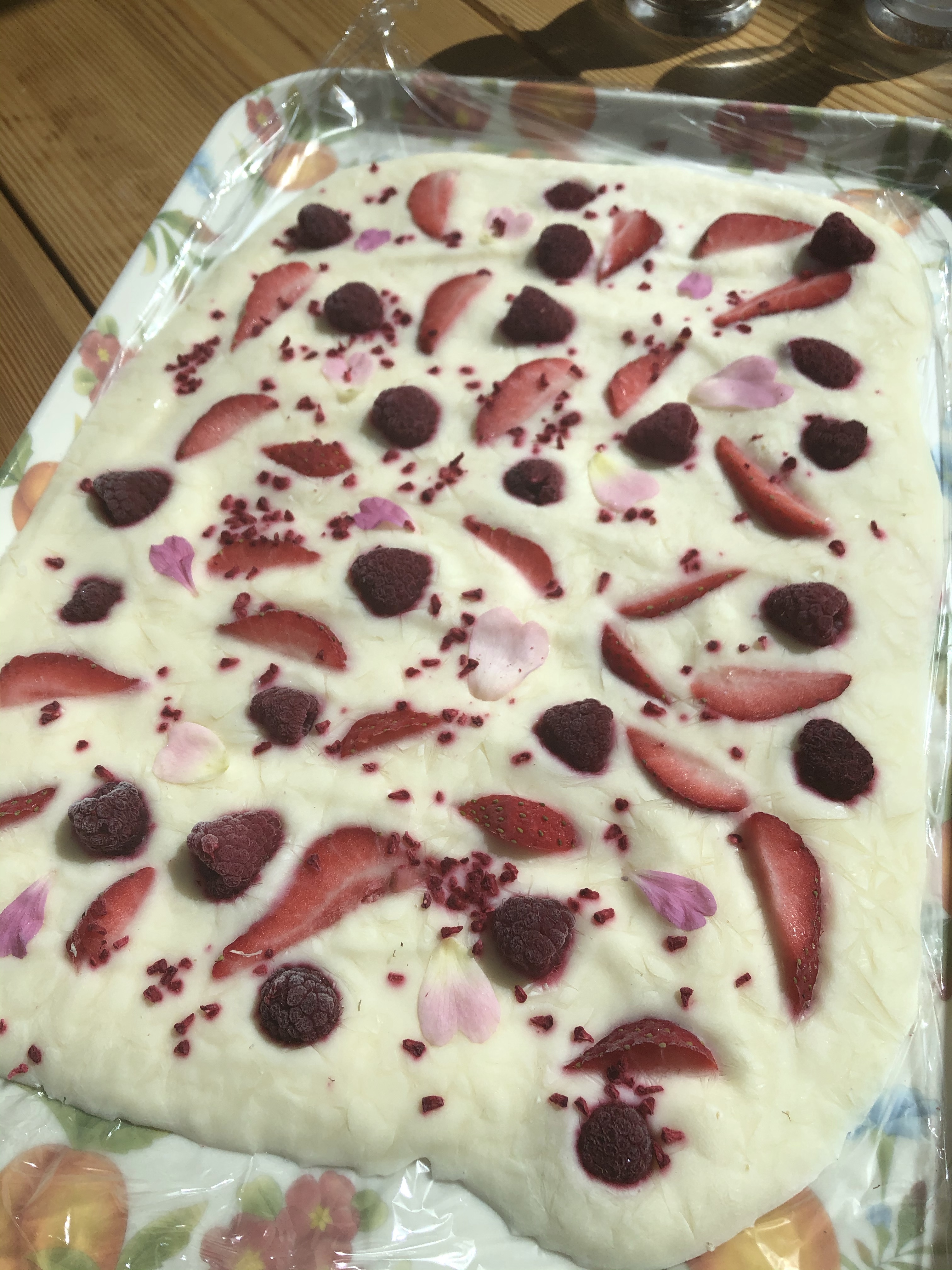 Stir the maple syrup and rose water into the yoghurt and spread evenly over the tray but not too thinly. Scatter the strawberries and raspberries evenly over the mixture, gently pressing into the yoghurt. Gently place the petals, if using, in between the fruit, making sure that they’re pressed flat into the youghurt. Sprinkle the whole bark with the dried raspberry pieces.