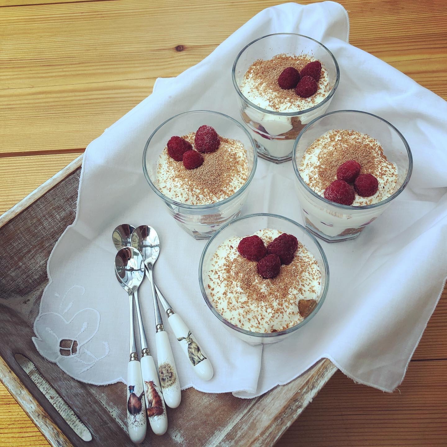 Ready to assemble; divide half of the sponge and coffee mixture between 4 glasses or small bowls, top with half the yoghurt mix and then half the raspberries and their juice, repeat with another layer of each.