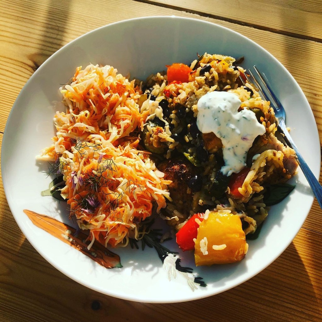 Remove from the oven then mix in the black beans and rice and return to the oven to heat through for 5 minutes.
