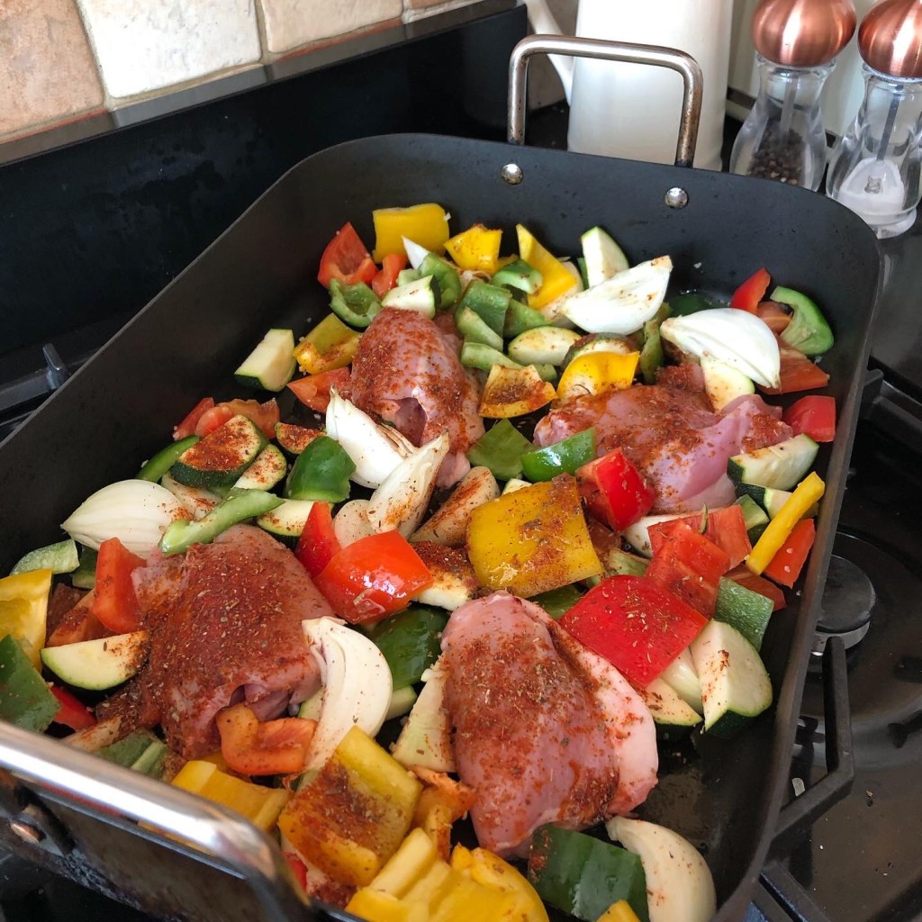 Nestle the chicken thighs amongst the vegetables, add a quick spray of low calorie spray to each thigh and shake over some more Fajita spice (this will go crispy as the chicken bakes)