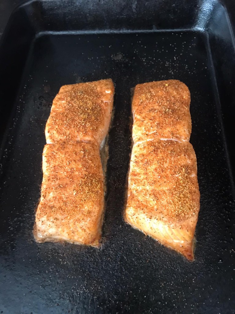When the salmon is cooked transfer to a cutting board and flake up, or if you prefer you can leave the fillets whole.