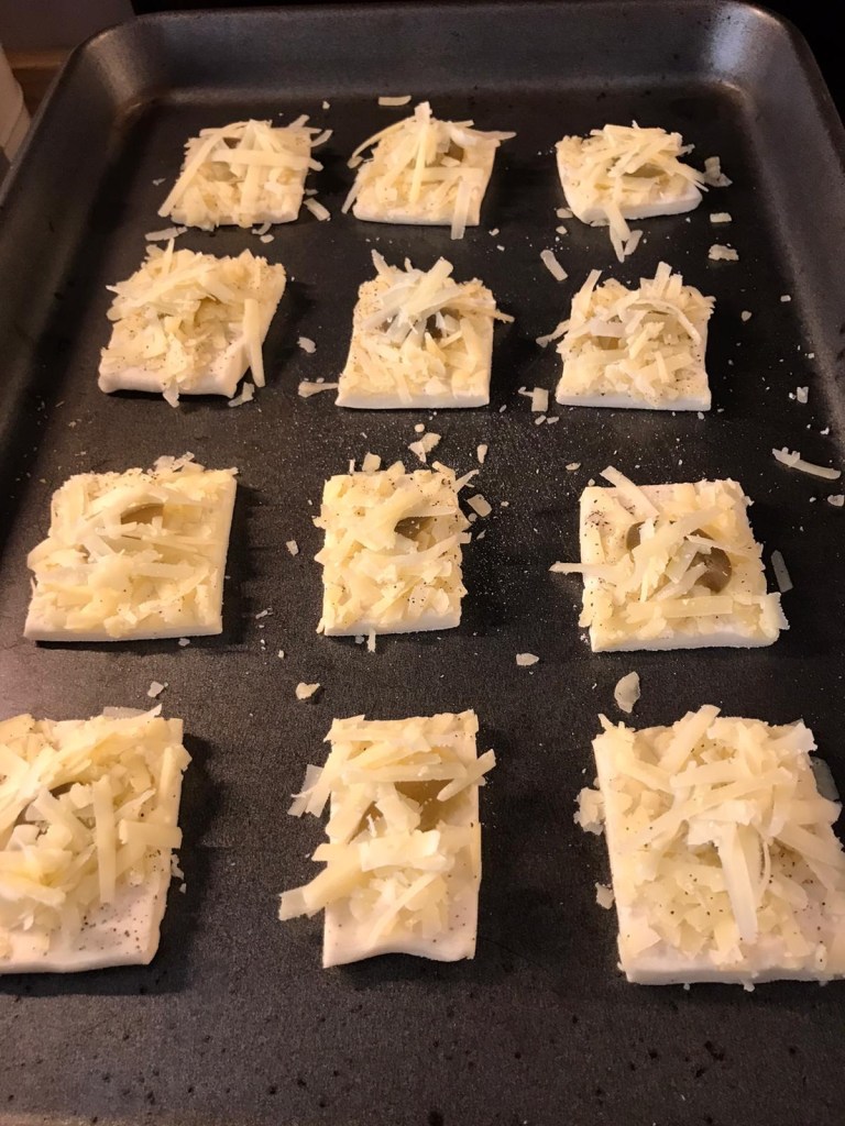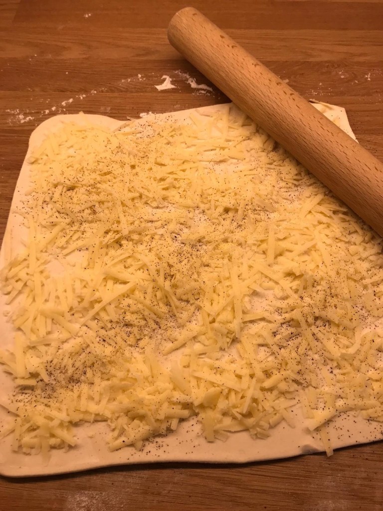Cover the pastry with half the grated cheese, sprinkle a bit of salt and pepper, roll over the cheese top with the rolling pin to push the cheese into the pastry then and cut into 36 x 5cm squares approximately.