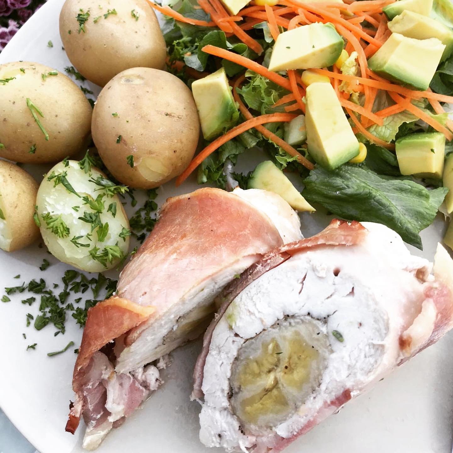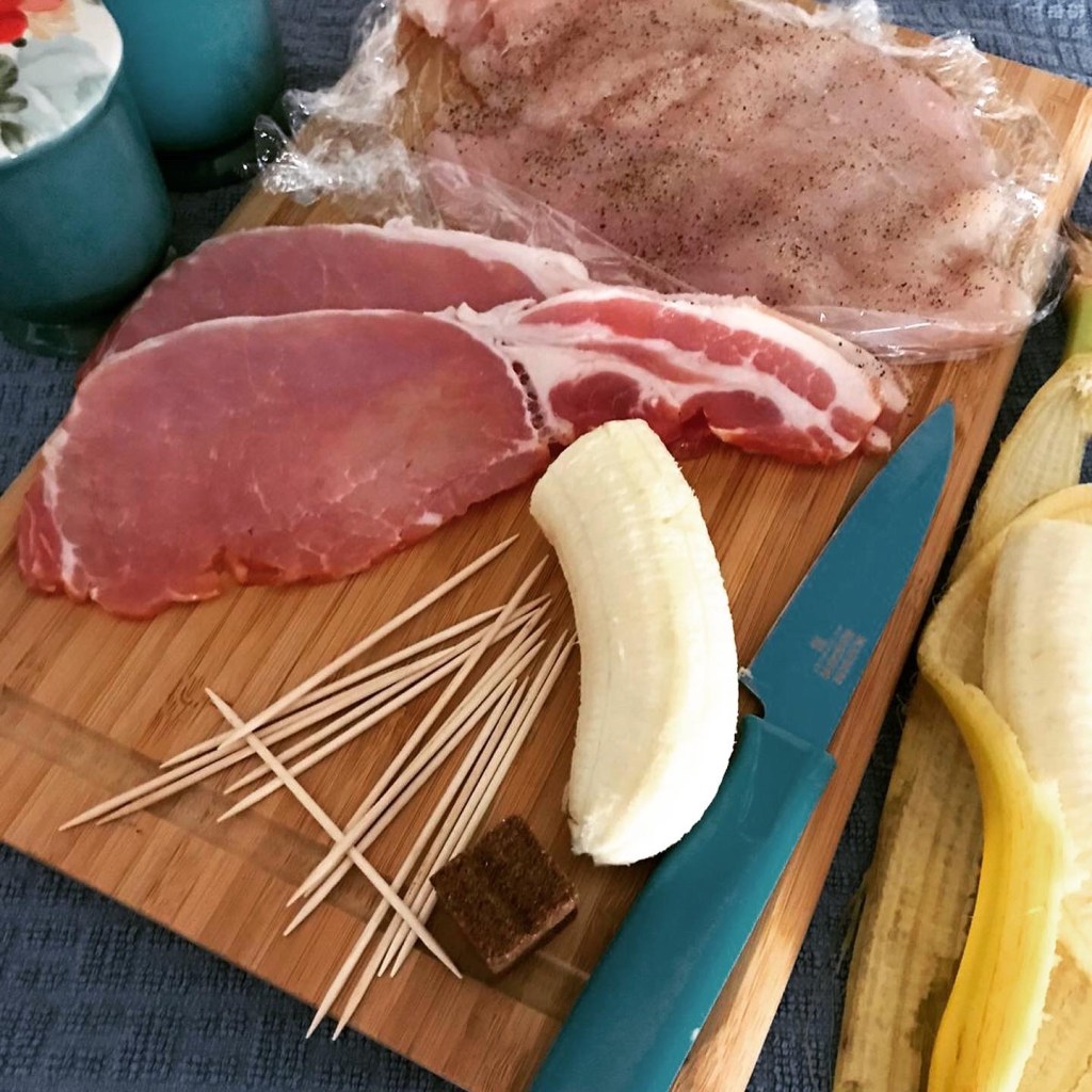 Sprinkle each chicken breast with salt and pepper and place a peeled banana half on top of each flattened chicken breast, then roll up.