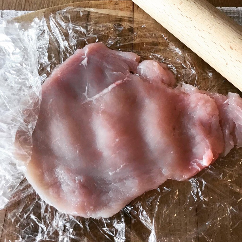 Using a rolling pin, gently bash out the chicken breasts between double thickness clingfilm, until they are thinner, if you don’t have a rolling pin you could use the flat side of a steak hammer or the base of a small saucepan.
