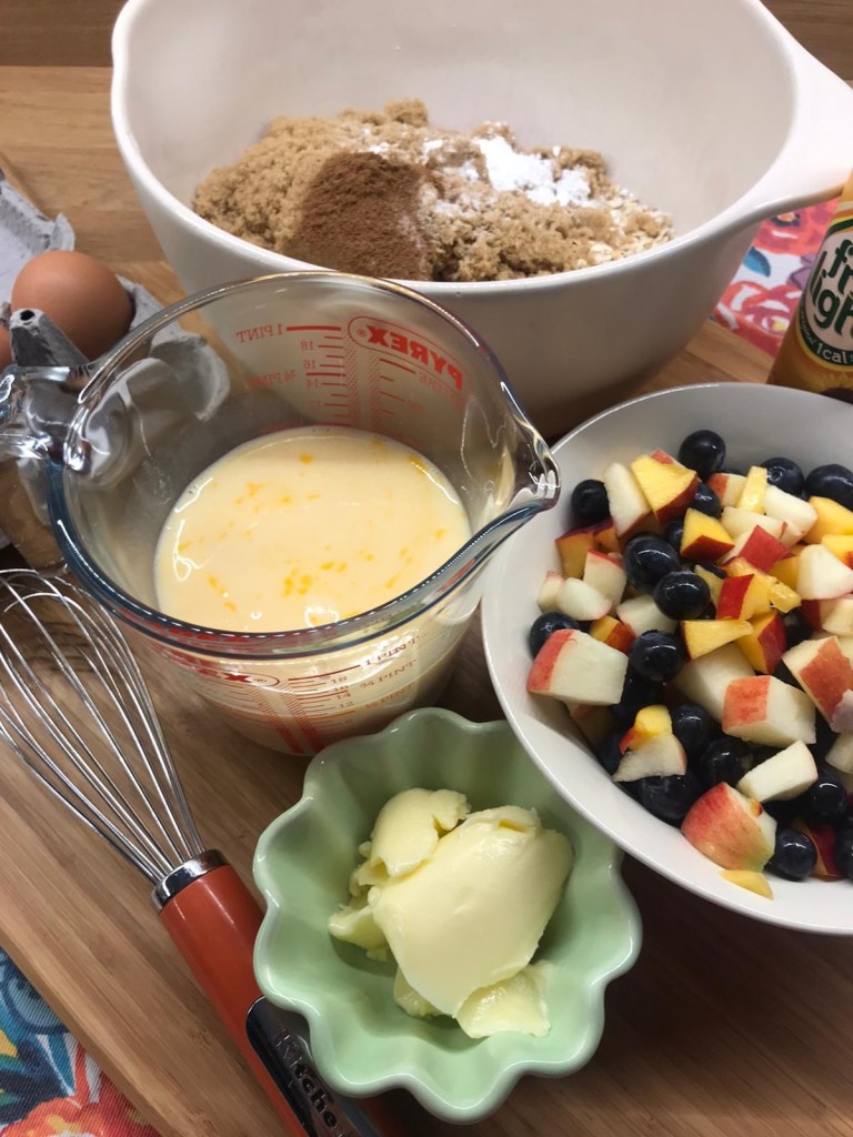 In another bowl combine the eggs, milk and butter, add to the dry ingredients, stir well.
