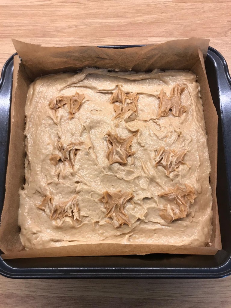 Spread the mixture evenly into the tin and dot over the extra 30g of peanut butter and gently swirl into the cake batter with a knife, bake for 20 – 25 minutes or until a toothpick comes out clean from the cake.