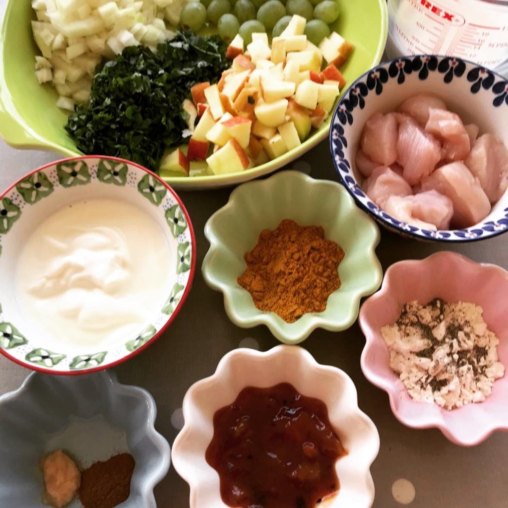 Remove the chicken from the pan, add some more spray and add the onions, stir for a few minutes, then add the apple, chutney and spices. Cook for another couple of minutes stirring all the time.
