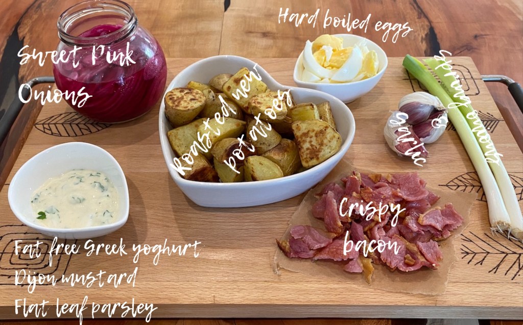 Assemble the salad in a large serving dish. First add the dressing, then the potatoes and the pink onions, and then the spring onion and garlic, mix through to cover the potatoes. Add the egg and gently combine making sure you don’t break up the eggs too much. Finally scatter over the bacon.