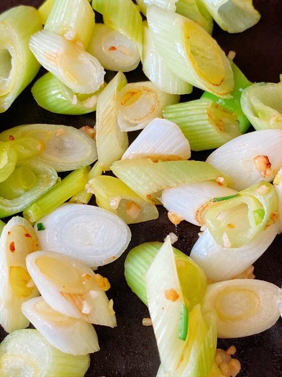 Spray a non-stick frying pan with cooking spray and lightly fry the spring onions and garlic until they are slightly caramelised.