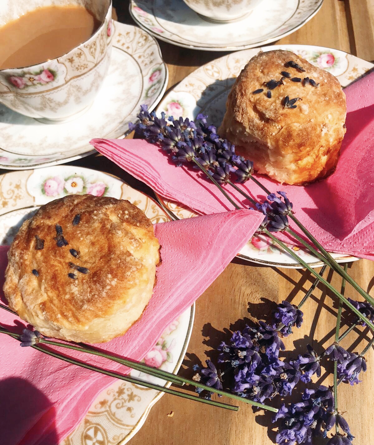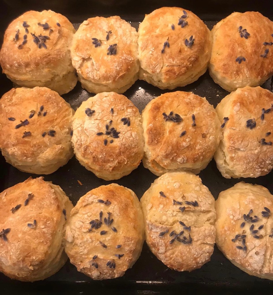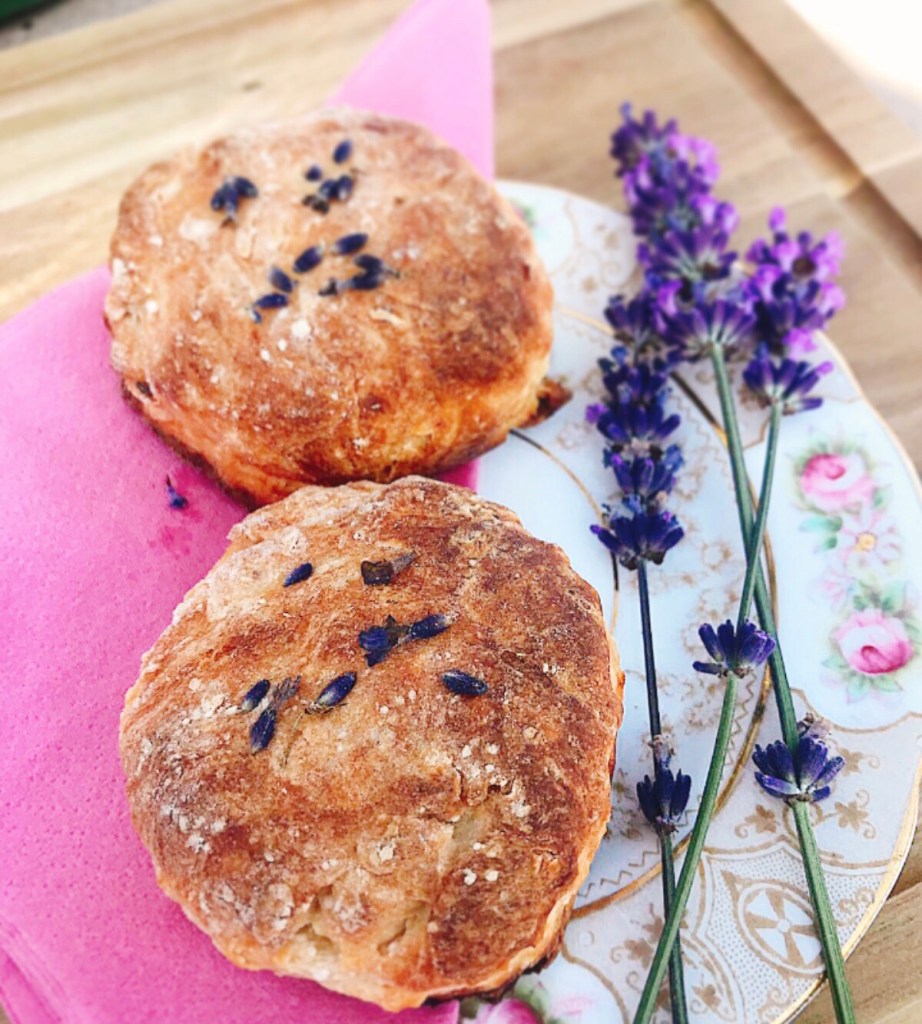 Place the scones into the prepared greased pan and sprinkle over the remaining lavender flower buds and bake for about 15 minutes or until risen and golden brown. Cool on a wire rack.