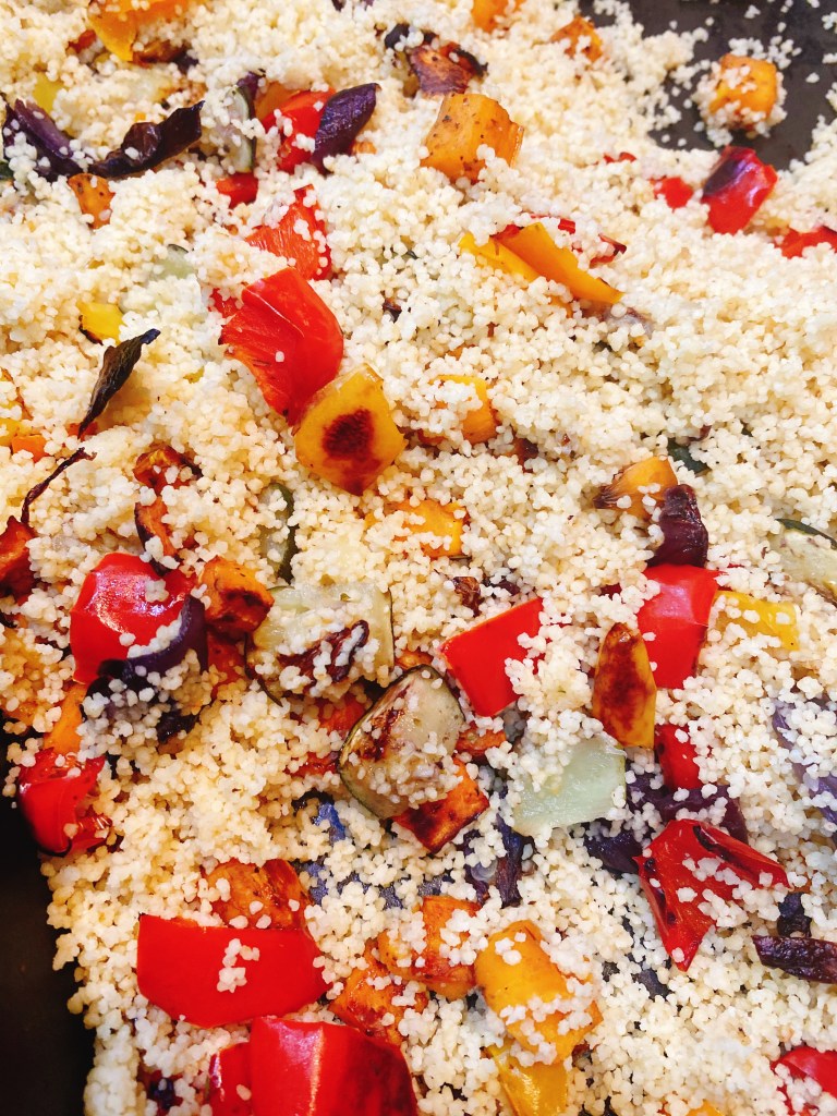 Tip the couscous into the tray with the vegetables and stir making sure you get all the gooey, crispy bits from the bottom of the pan.