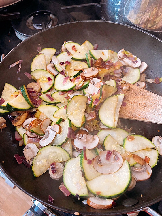 Return the large stock pot to the stove, over medium heat and spray with cooking spray. Add the courgette, mushrooms, and onions. Sauté over medium high heat for 5-6 minutes or until the vegetables are starting to brown and are cooked through.