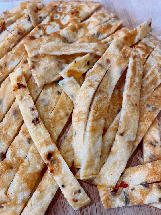 Spray a non-stick pan with low calorie cooking spray and set over a low-medium heat. Add the beaten eggs and red pepper flakes and make a thin omelette. Once cooked, set aside to cool and cut into thin strips.