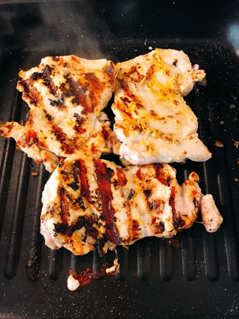 Heat a non-stick grill pan on the top of the cook until very hot, place on the chicken thighs, cook for 5 minutes, turn over, and cook on the other side until golden brown. Slice up and set aside.