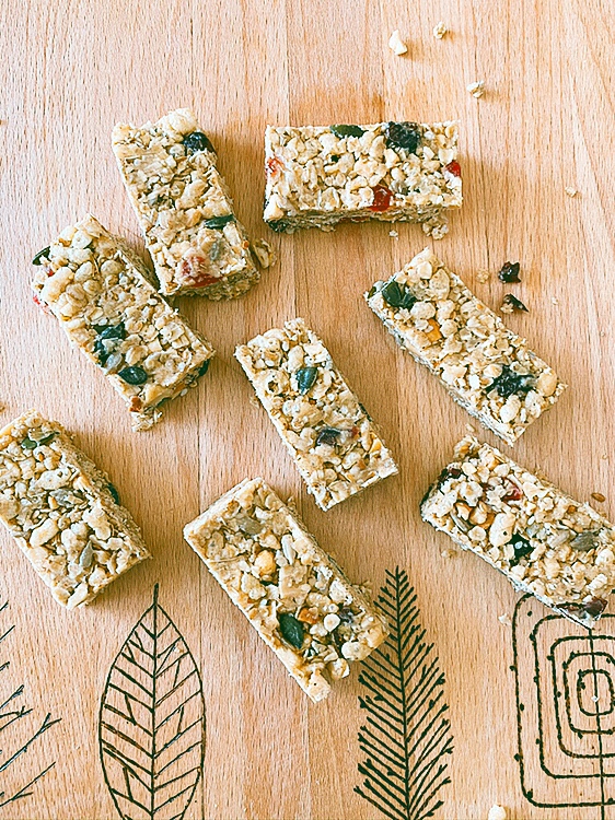 Place the porridge oats (not the jumbo ones) and almonds into a food processor and blitz for 10-20 seconds until fairly well broken down – you want chunks for texture but if they are too large they won’t stick together. Pulse the mixture again until slightly powdery. Tip into a bowl then add the jumbo oats, seeds, dried fruit and cereal and stir the mixture really well. Set aside.