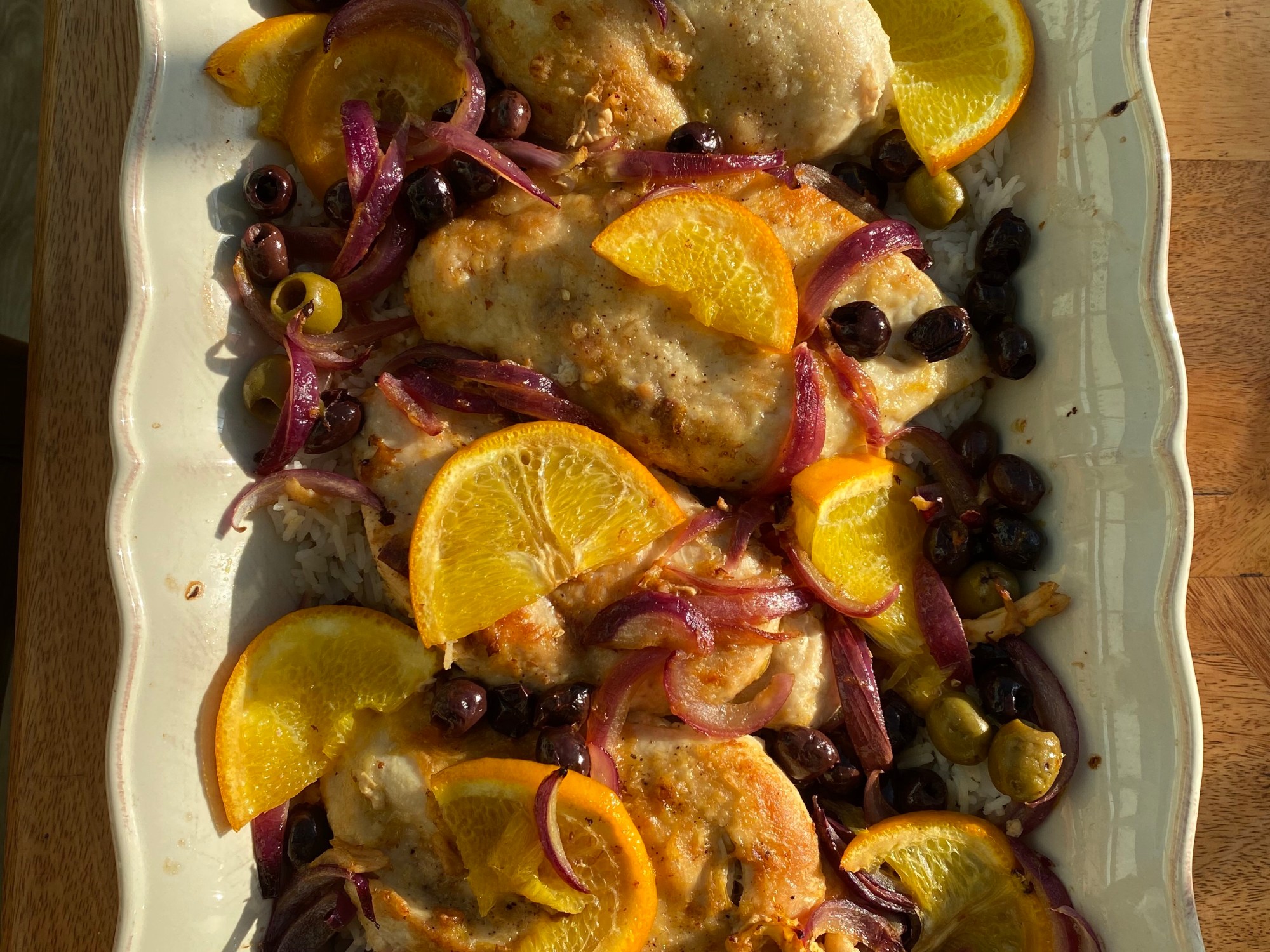 Check the rice is cooked, drain and add to the serving dish. Add the chicken on top and pour over all the juices, onions, oranges and olives.