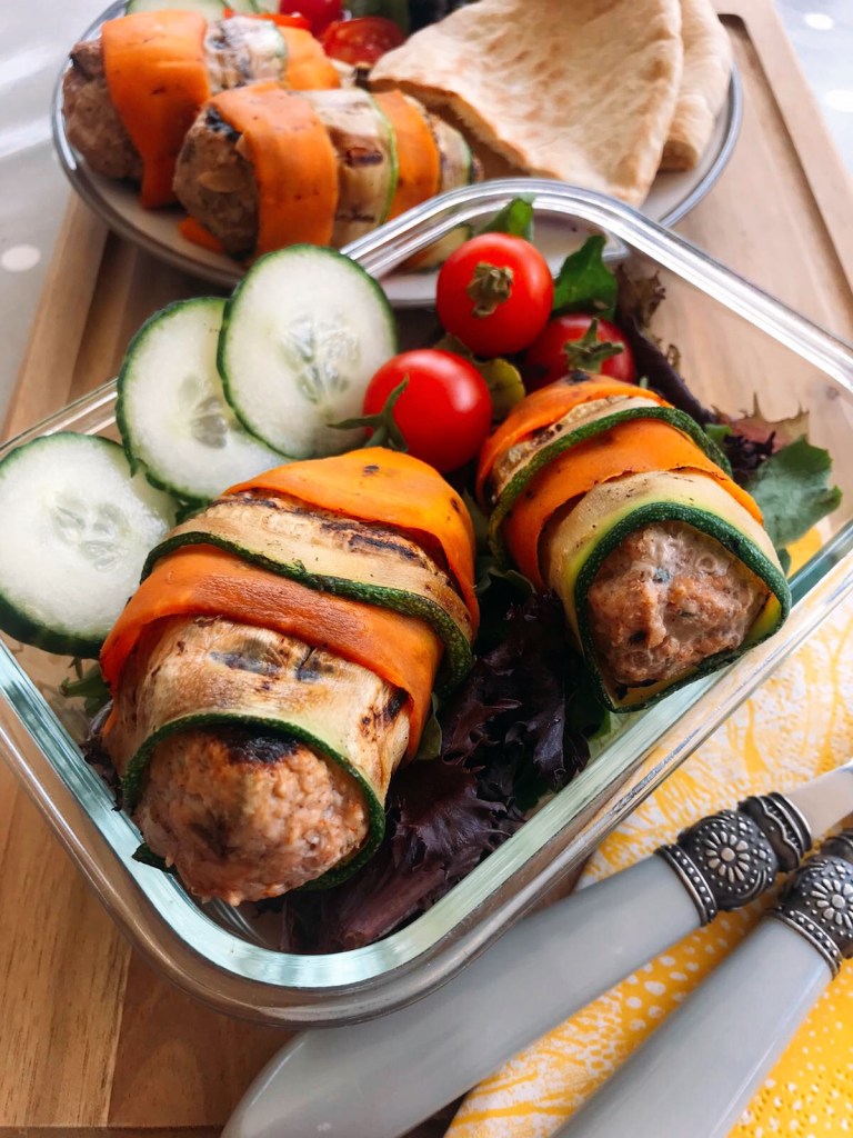 These delicious little homemade sausages wrapped in thin slices of carrot and courgette are a cross between a sausage roll and a pig in a blanket (or in striped pyjamas!) but with a fraction of the calories.