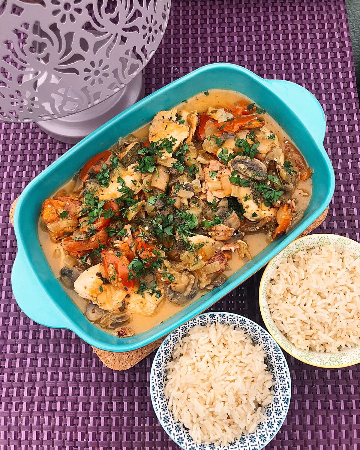 Place in a serving dish and garnish with the fresh parsley and serve with the warm rice.