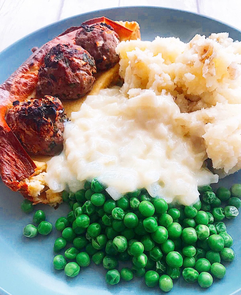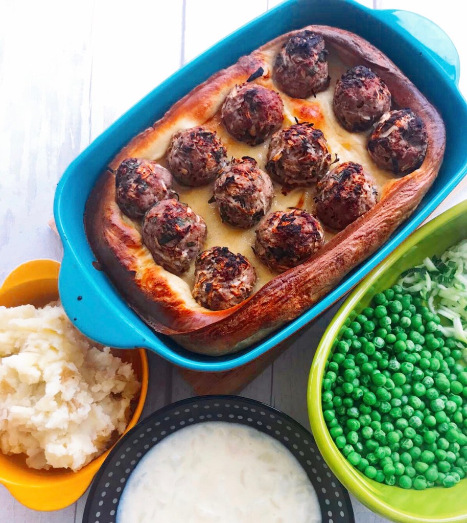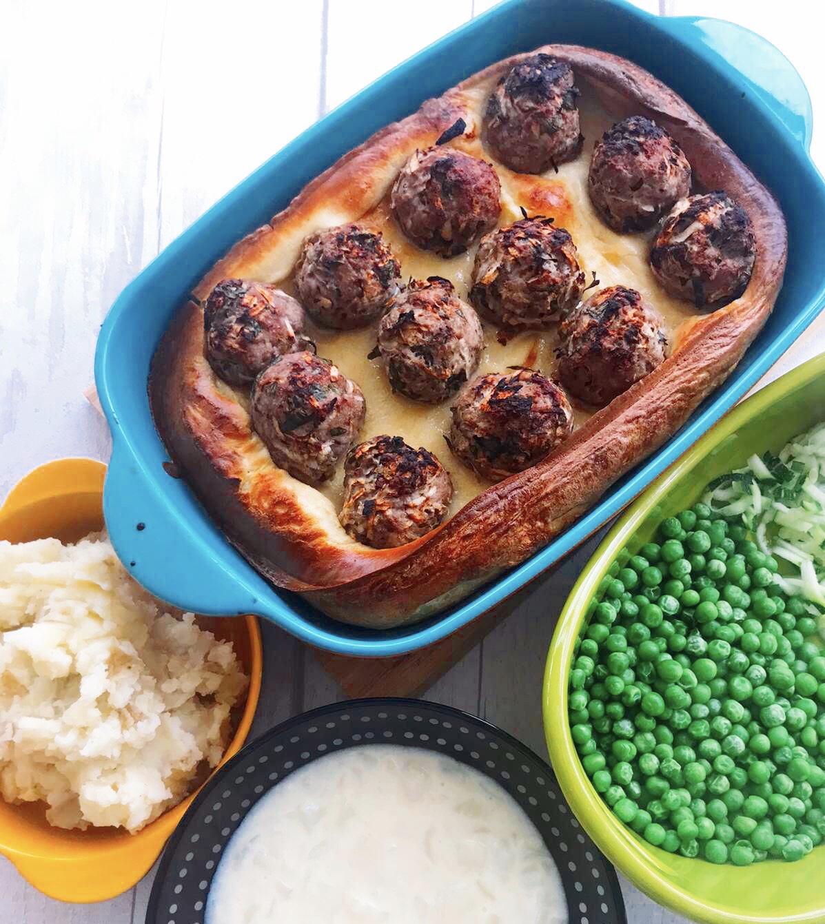 Over the years I have made lots of toads in the holes, but having found this recipe I prefer it, I love the combination of pork and apple which go so well together, the crispy yet juicy sausage balls which are encased in the golden baked Yorkshire pudding and served with the rich and decadent onion sauce are just a pure delight on the plate. We hope you enjoy this recipe as much as we did.