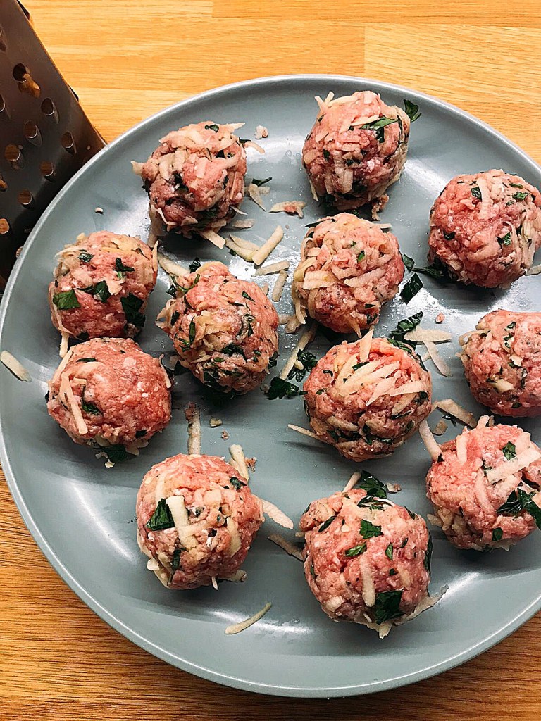 Place the sausages in a bowl with the grated apple, chopped parsley and salt and pepper, mix and roll into 12 small balls.