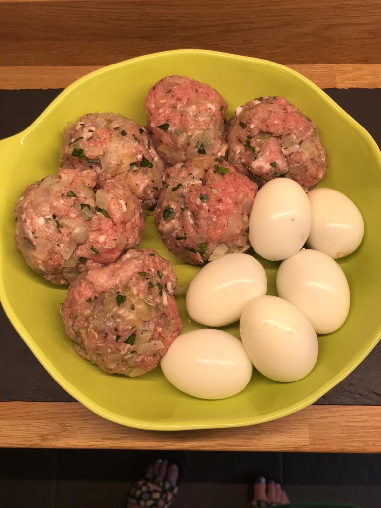 Divide the meat mixture into 6 equal balls, lay a ball of the sausage meat mixture onto a sheet of cling film, then lay another sheet on top and press into a 12cms circle, approximatly, remove the top piece of cling film, place an egg in the middle and bring the sausage meal mixture around the egg, pressing it and smoothing it around the egg making sure the edges are brought together until the egg is completely sealed.