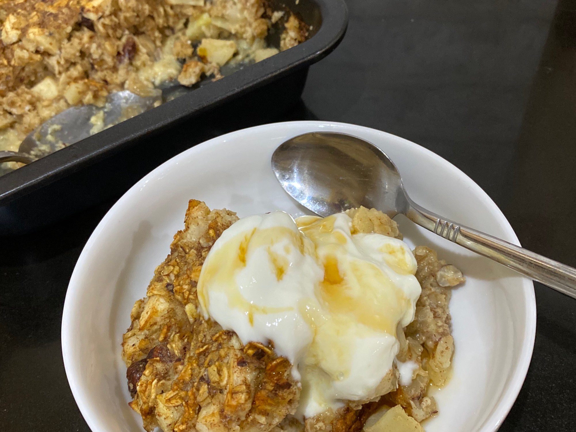 It’s Apple season and I’ve got so many windfalls in the garden that I’m squeezing them into every dish! This is really lovely as a warming breakfast but could also be served with ice cream for a not too indulgent dessert.