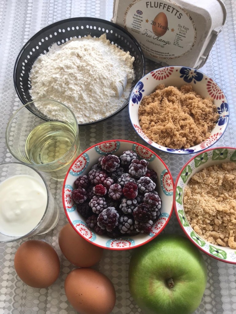 Sift the flour into a large bowl, stir in the frozen blackberries, grated apple, soft brown sugar, lightly beaten eggs, vegetable oil and yogurt milk mixture, stir until smooth and combined, but do not over mix.