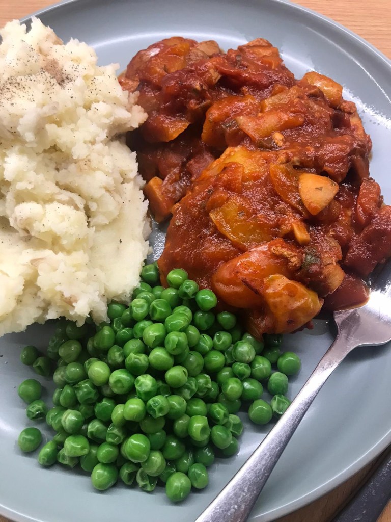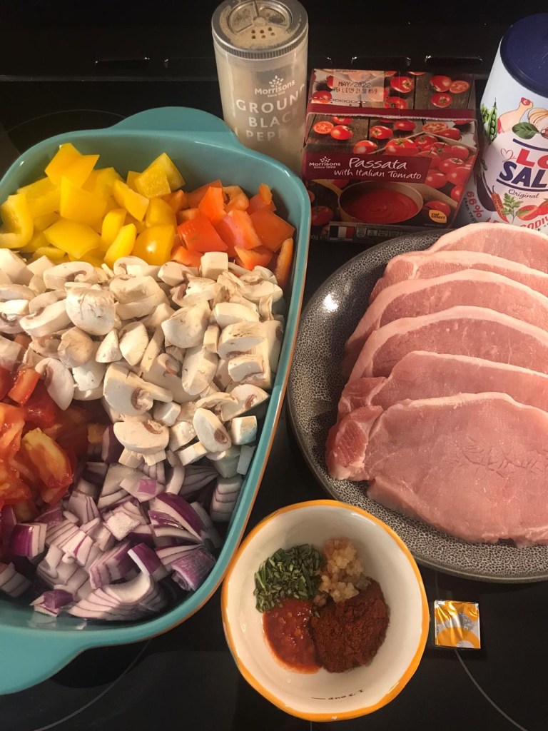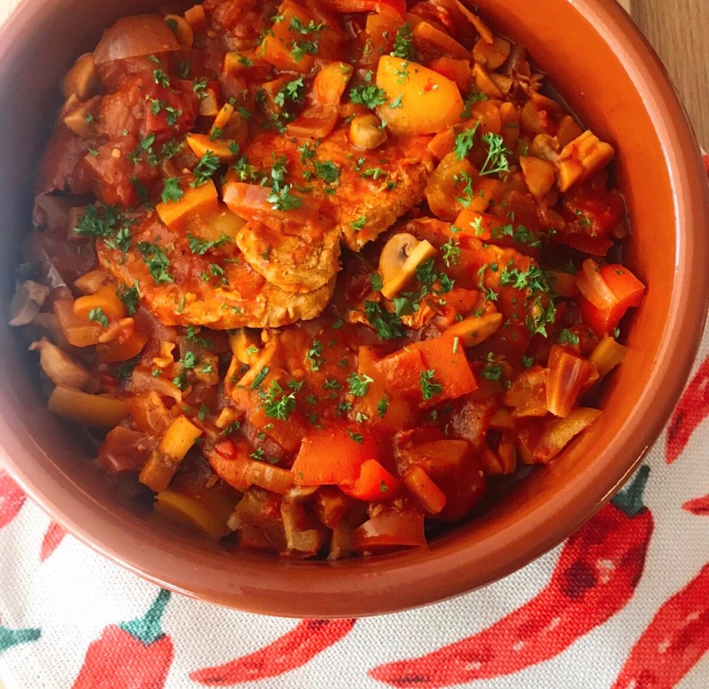 Succulent port loin chops smothered in a rich spicy tomato sauce chunks of delicious peppers onions and mushrooms served with creamy mash potato and fresh vegetables.