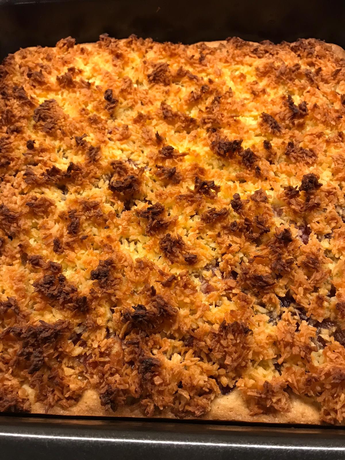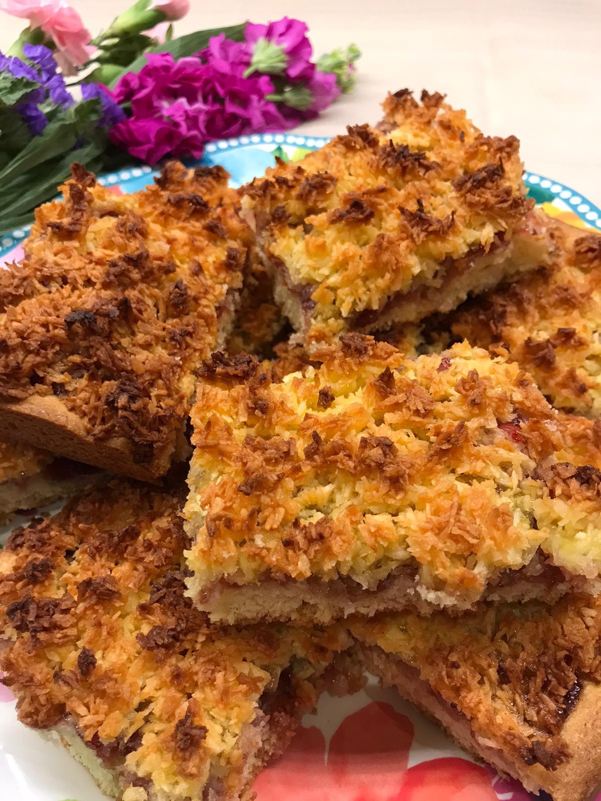 This sweet moist jammy coconut treat is nice with a cup of tea or as a pudding with custard and cream. I love the light sponge base covered in a fruity jam then topped with the crispy coconut topping.