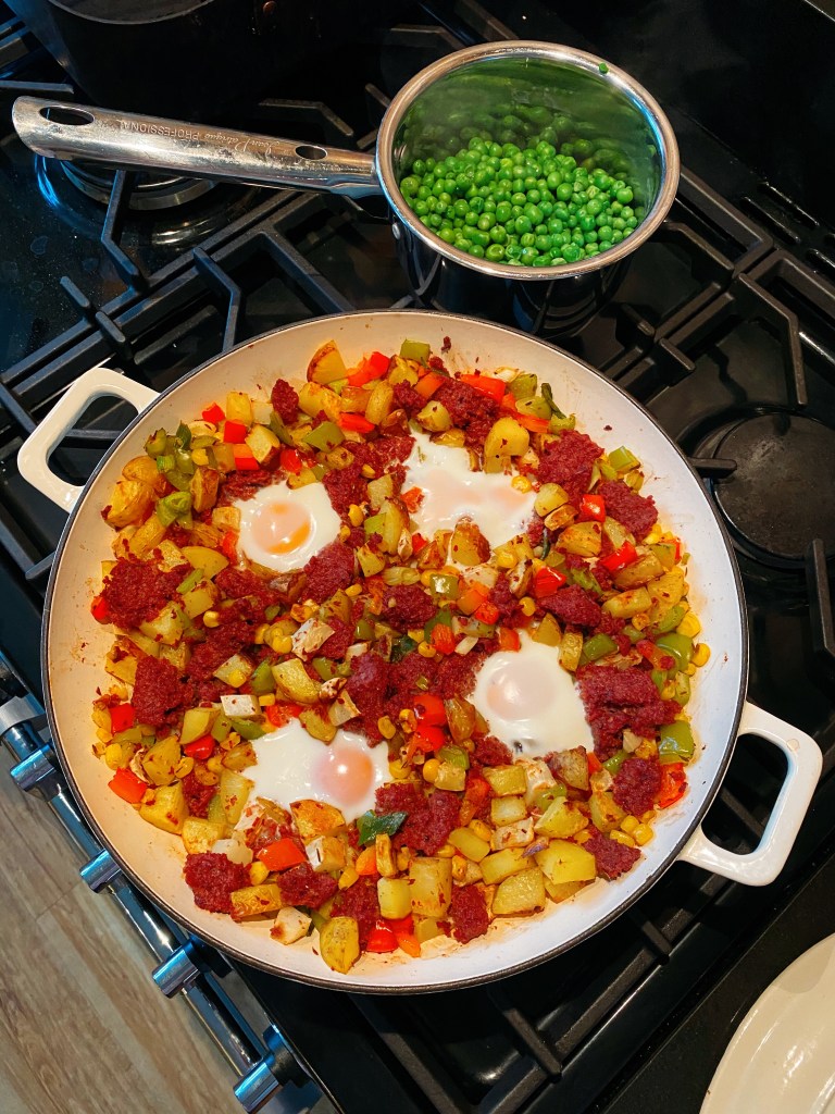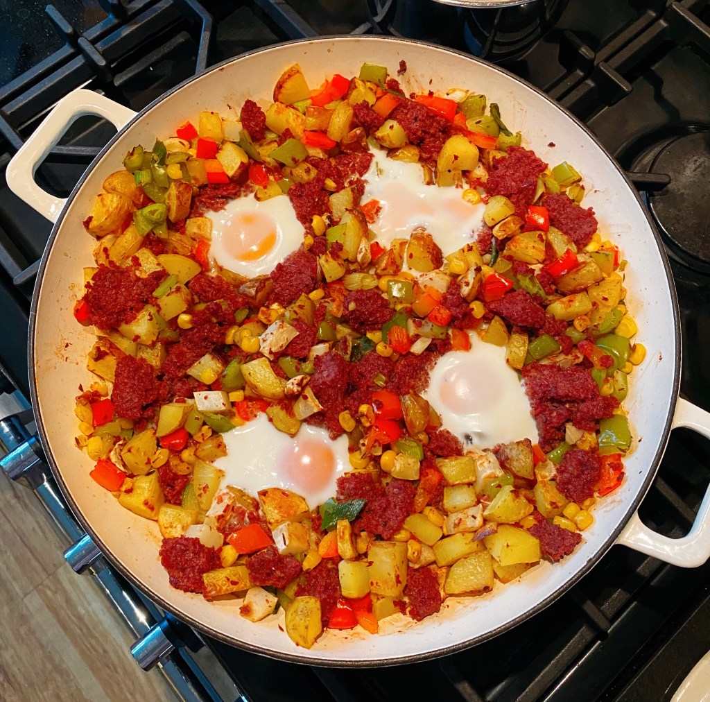 Add in the potatoes, stir to combine and cook through for about 5 minutes. Flatten down the mixture with a wooden spoon and then make 4 wells. Break the eggs into the wells and put back into the oven for 10 minutes.