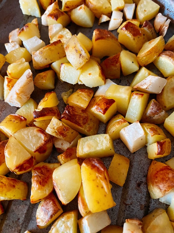 Put the diced potatoes, in a single layer on a baking tray and spray with cooking spray, season with sea salt and bake in the oven for about 25-30 mins (shaking the pan half way through) until lightly golden and crispy. Remove from the oven and set aside.