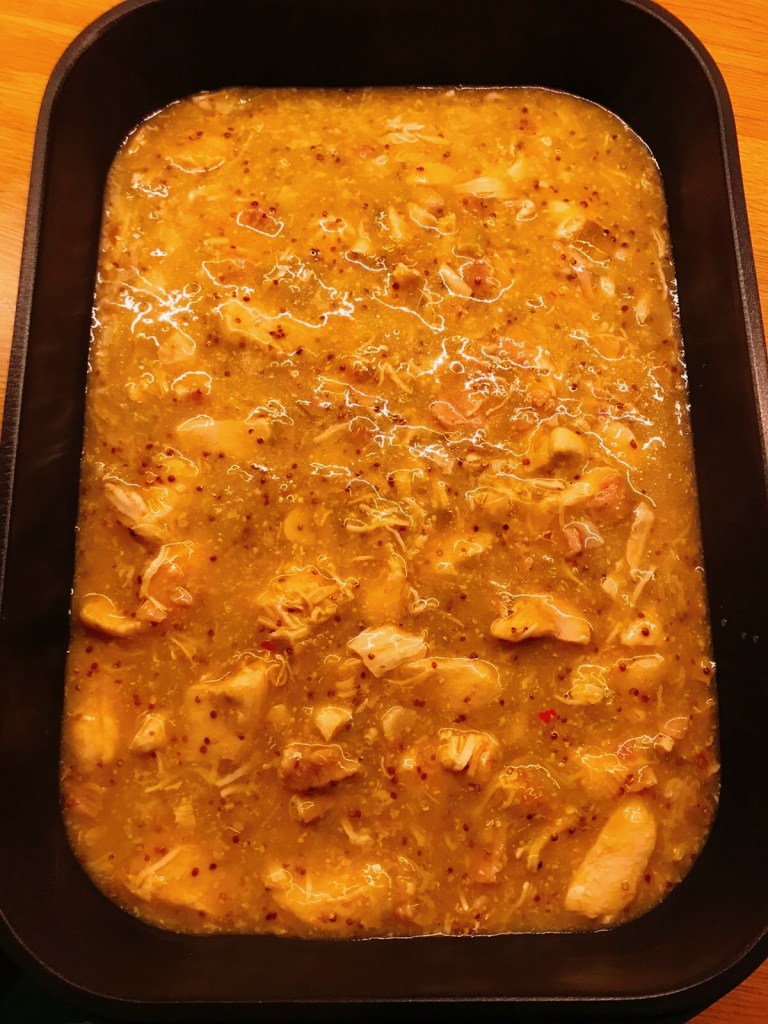 Place a non – stick lidded saucepan over a medium heat, add the chicken chunks, bacon and leeks and cook on a gently heat for 10 minutes until lightly brown. Add the chicken stock, chilli, mustard and combine. Stir the cornflour with 2 tablespoons of water and stir to make the thickening, when combined add to the chicken mixture, this will quickly thicken the sauce, turn the heat to low so that the sauce does not burn on the bottom of the pan. Cook for another 30 minutes, slowly bubbling away with the lid on. Add the fromage fraise, 50g of the grated parmesan cheese and salt and pepper.