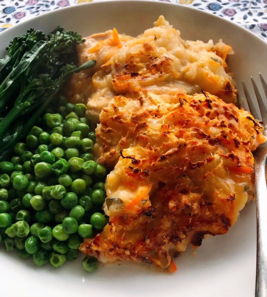 Transfer the chicken mixture to a large oven proof dish and careful place the mash potato mixture on the top and smooth into the edges, rough up the top with a fork sprinkle over the remaining parmesan cheese and place in the oven on a baking sheet just in case it bubbles over, cook for 30 minutes until golden brown and bubbling.