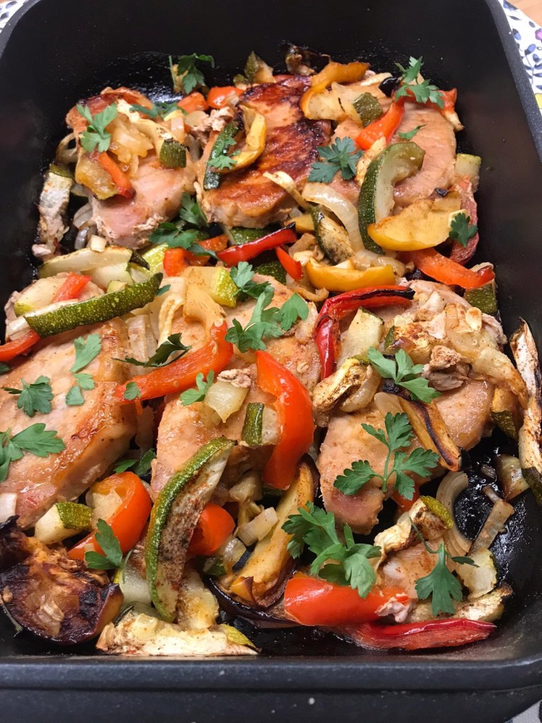 On a large non – stick baking tray or dish scatter half the red pepper, sliced onion, courgette chunks, and apple, then place the pork chops on top, sprinkle with the paprika, salt and pepper.