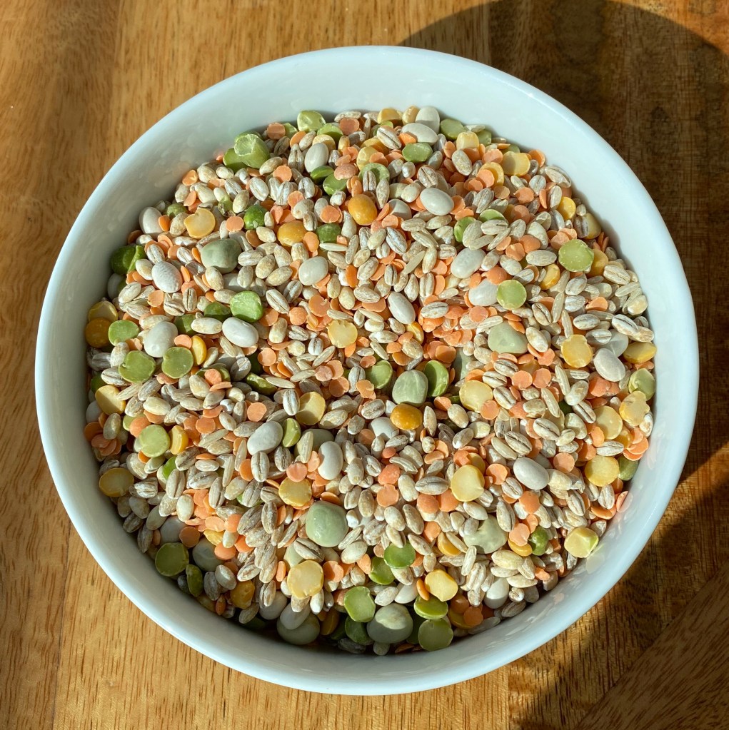 pre-soak the soup mix if necessary. I used Waitrose Soup Mix, a mix of pearl barley, haricot beans, yellow split peas, green split peas, red split lentils, marrowfat peas and brown rice which needs an overnight soak in cold water.