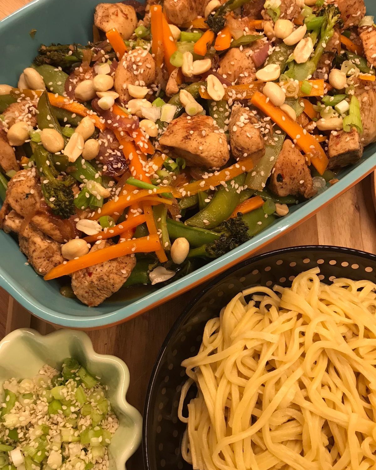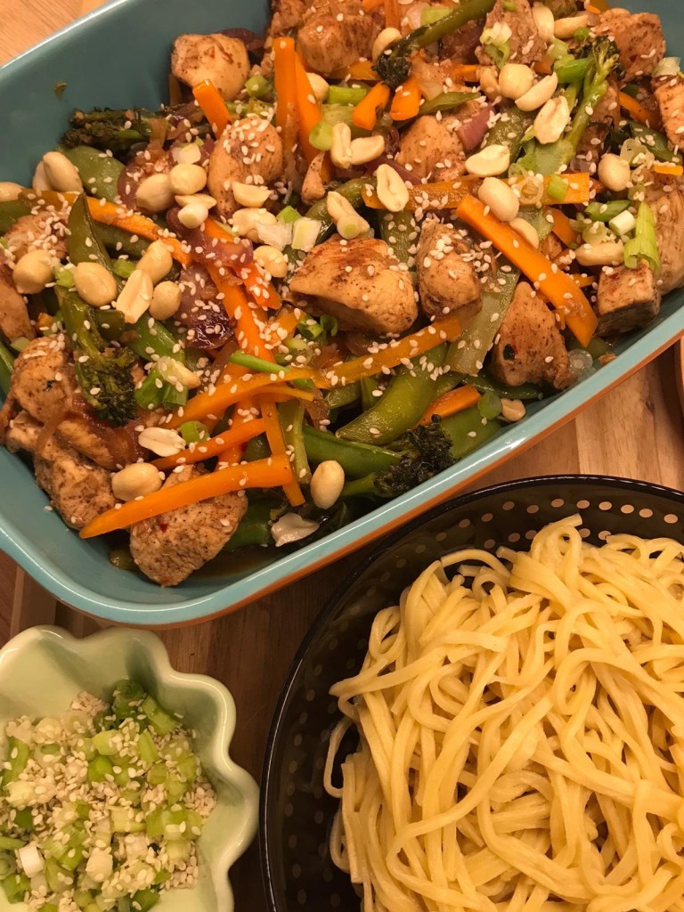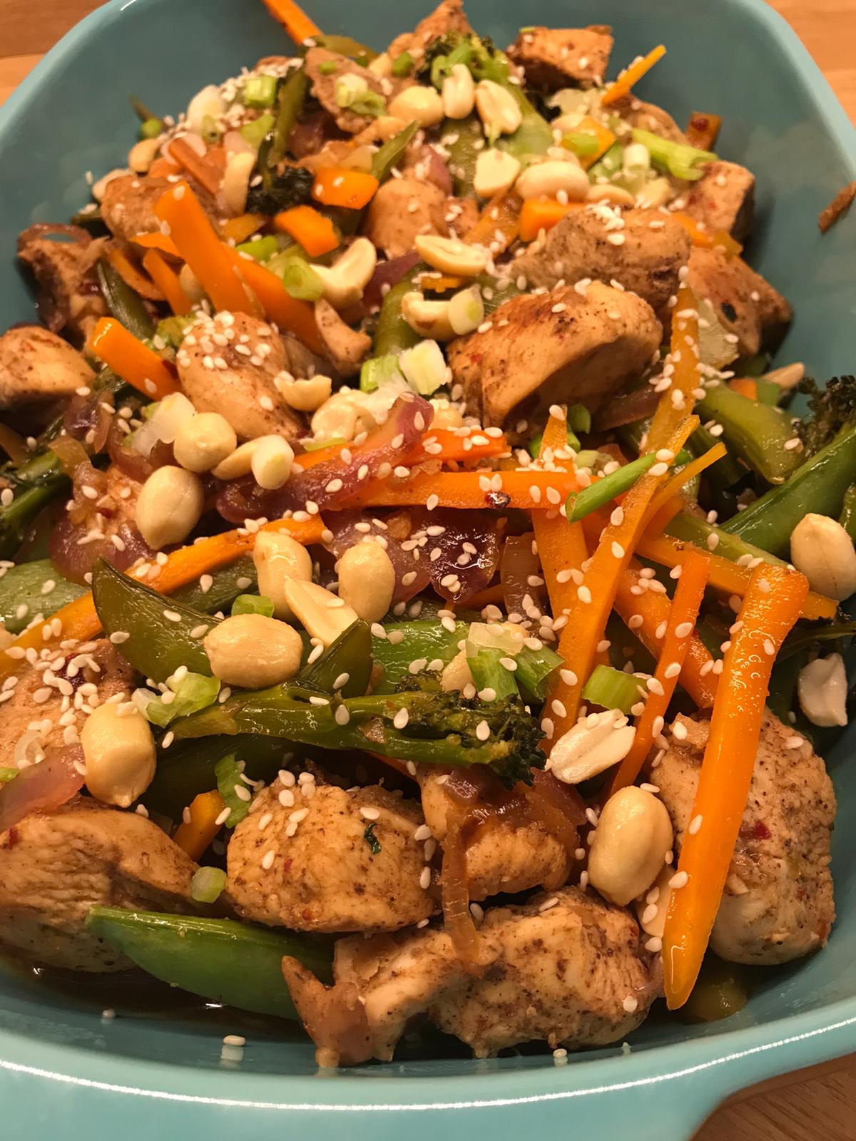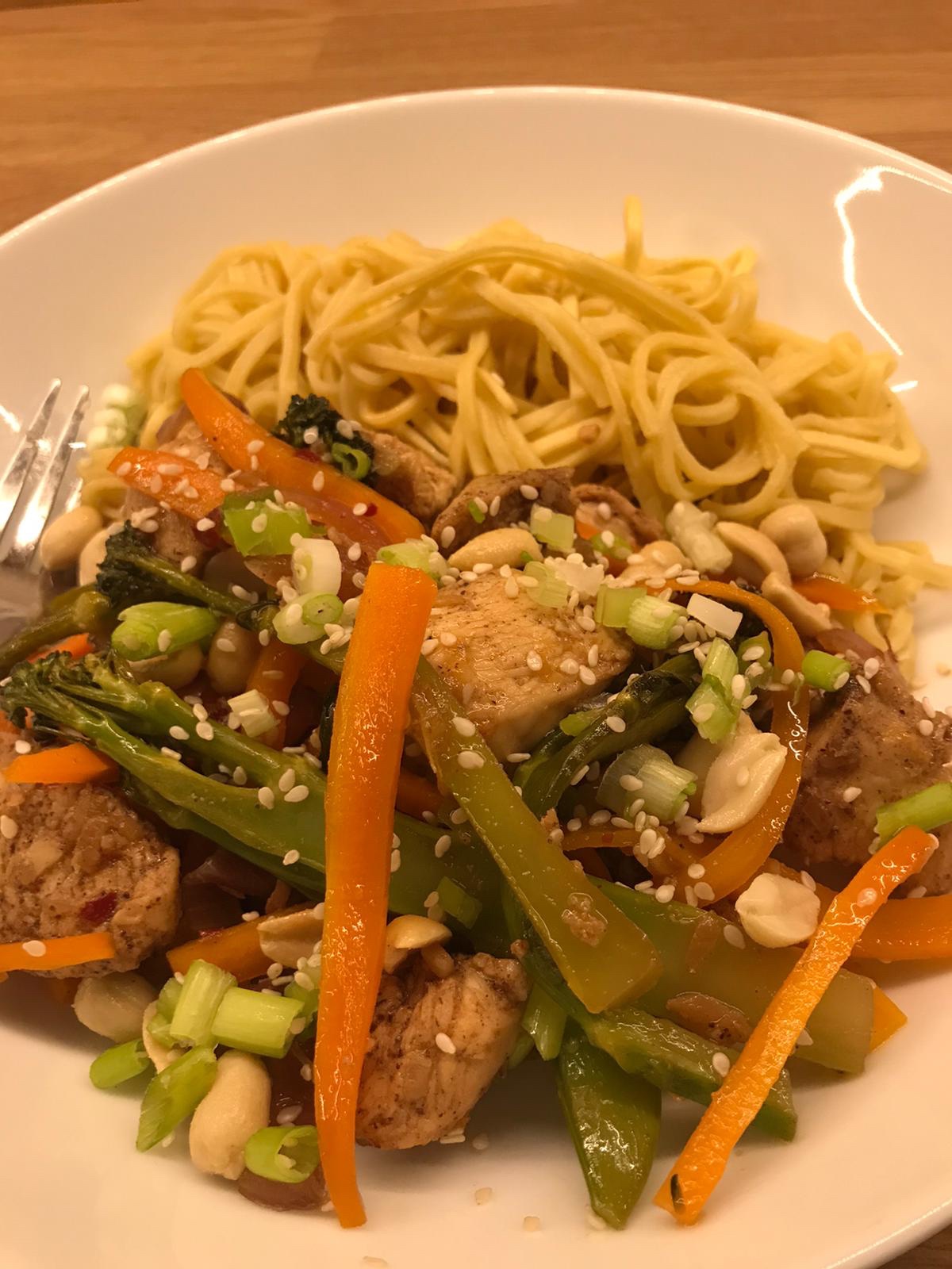 Delicious chunks of tender chicken marinated with ginger chilli garlic and Chinese five spice, gently cooked with colourful vegetables which remain crisp even after being cooked, then garnished with crunchy salted peanuts, spring onions and sesame seeds, served with your choice of noodles or boiled rice. This recipe would also work very well with pork, prawns or tofu.