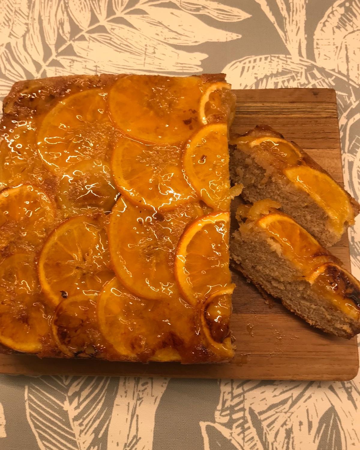 A delicious moist sweet but tangy cake from all the thin slices of orange and lemon on the top which is then glazed in the sweet citrus syrup.