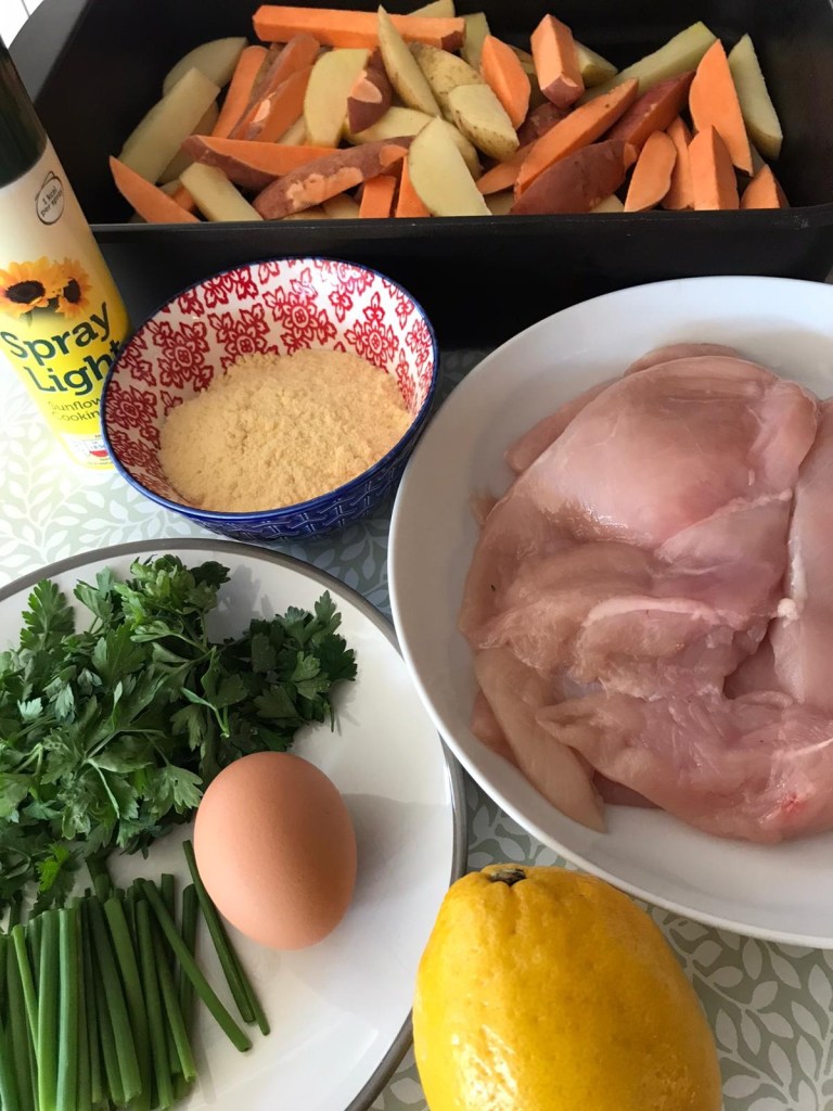 Combine the polenta, salt, pepper, lemon zest, chives and parsley in a large flat dish. Put the beaten egg into another dish. Dip the chicken breasts into the egg, then into the polenta mixture to coat evenly. Arrange them in the second baking tray in a single layer and spray with the low – calorie spray.