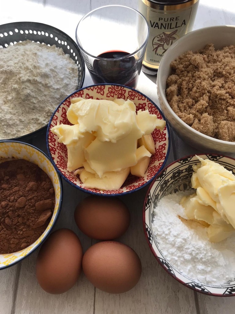 This rich moist chocolaty cake covered in vanilla and chocolate butter cream is a chocolate lovers delight, don’t worry about the red wine its not over whelming, I think it is at its best on the day of baking, but we enjoyed it the next day warmed in the microwave with vanilla ice – cream.