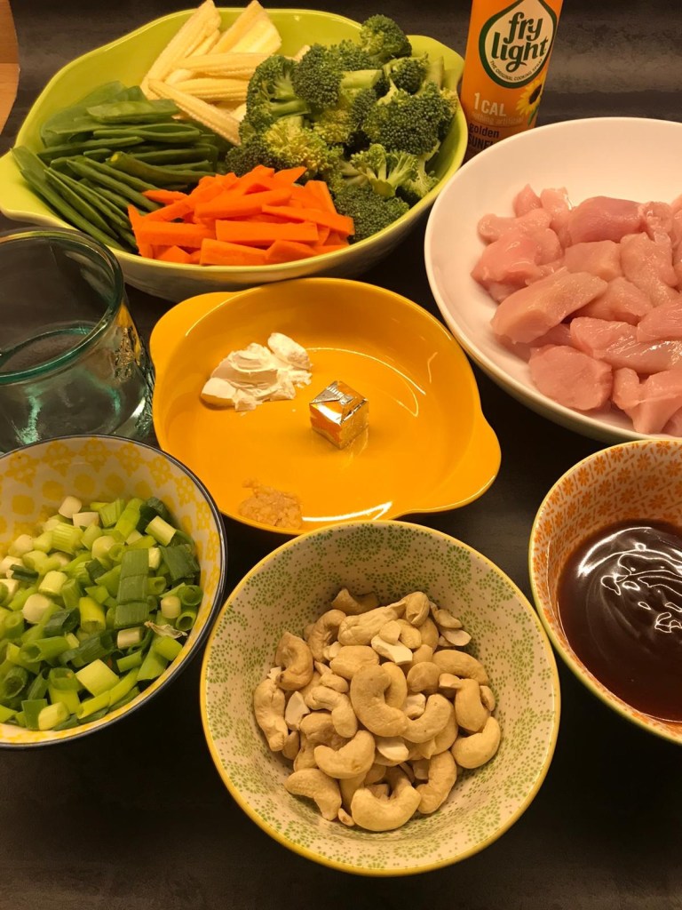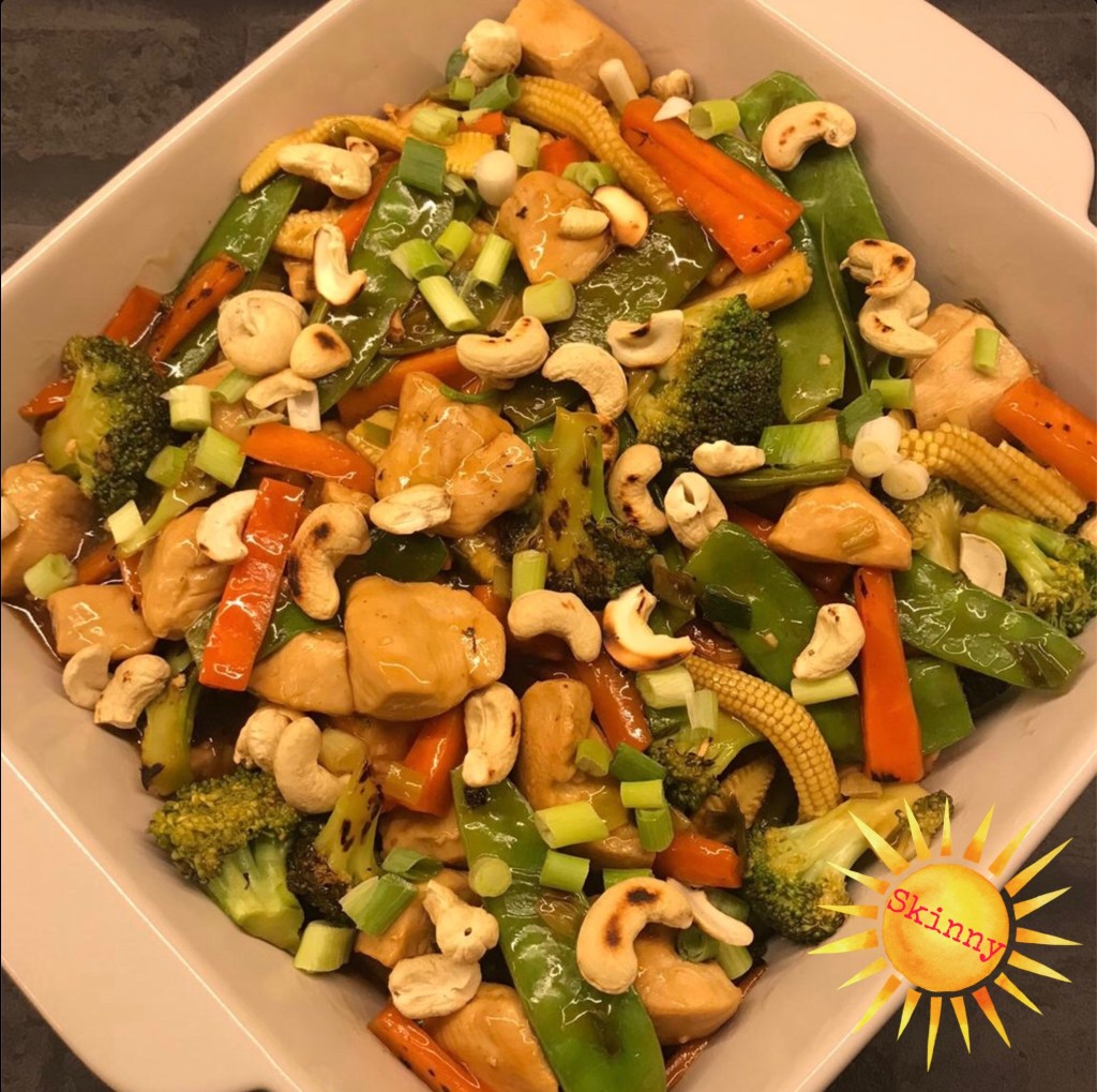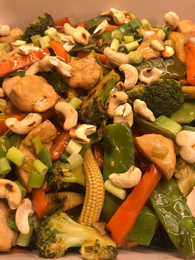 Tender chicken pieces, crisp baby sweetcorn, carrots, mange tout and broccoli cooked in a thick tasty sauce and all topped with crunchy roasted cashew nuts and spring onions.