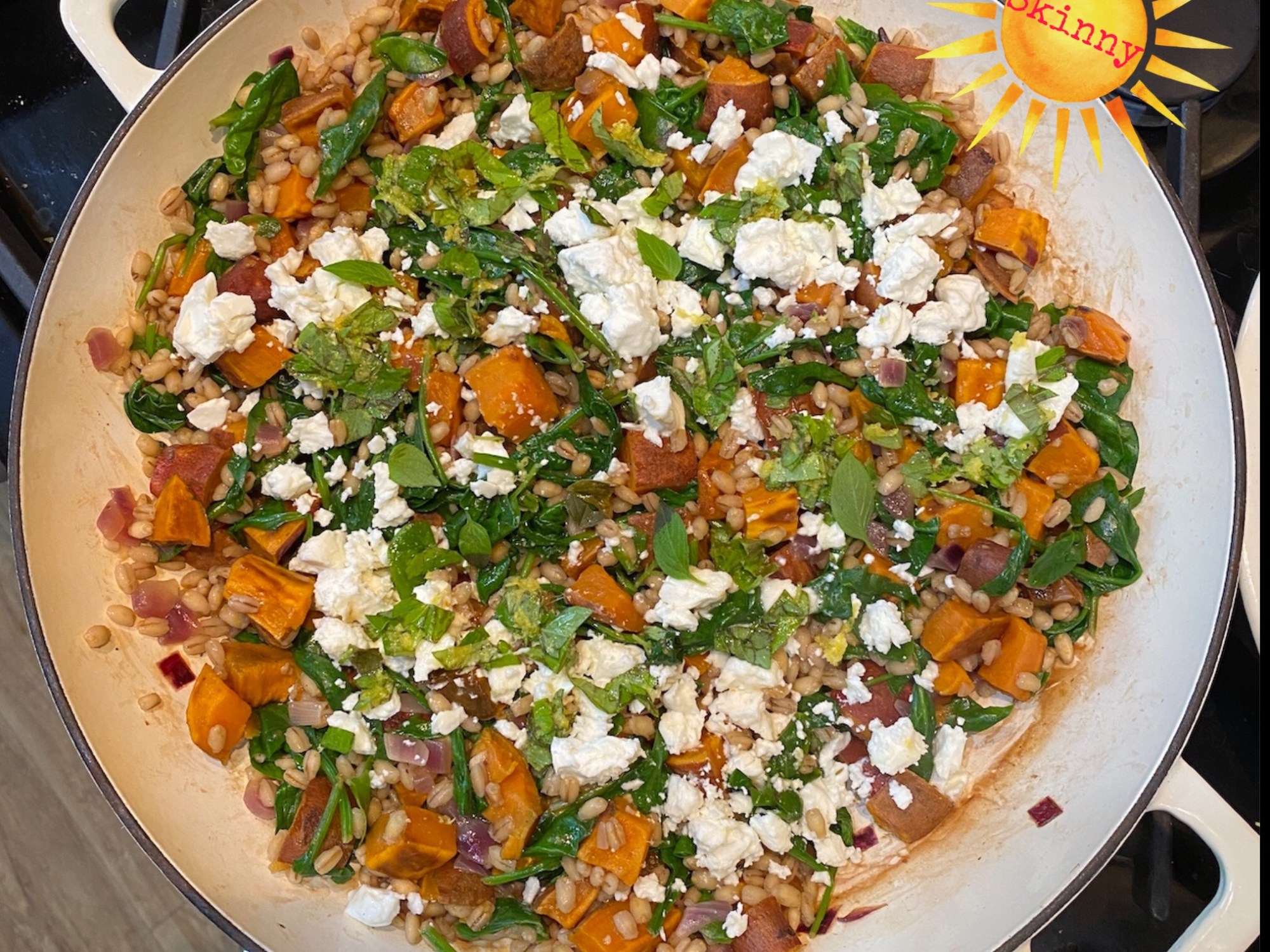 Add the sweet potatoes to the pilaf then, after 1 minute, add the spinach and cook until wilted. Season and serve with the basil/lemon drizzled over and the crumbled feta.
