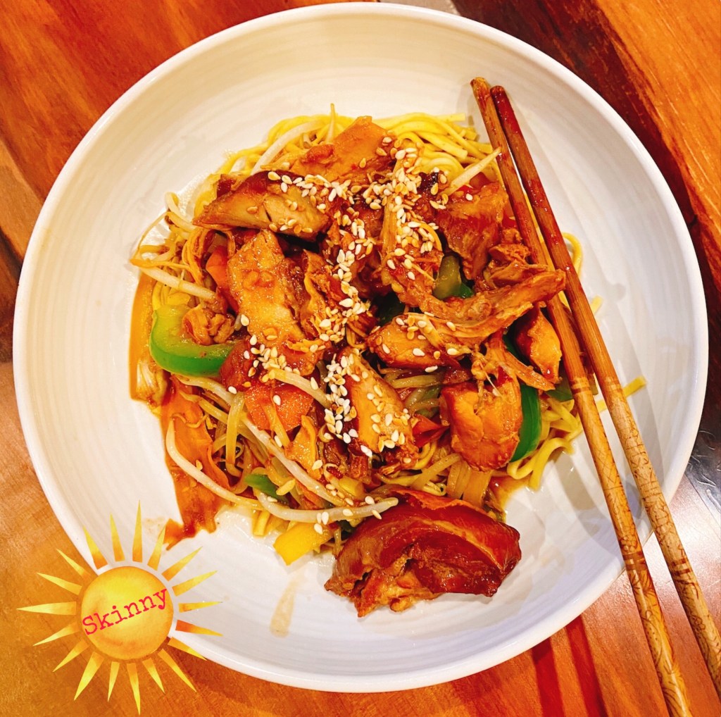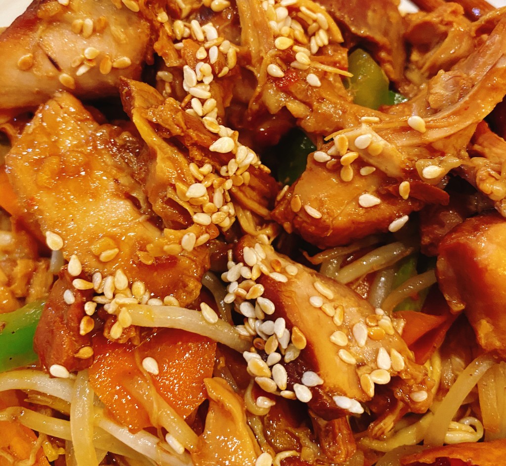 Towards the end of the cooking time prepare your vegetables and noodles and stir fry, add the sauce from the slow cooker to the wok/pan and stir through. Serve with the chicken on top and a sprinkling of toasted sesame seeds.