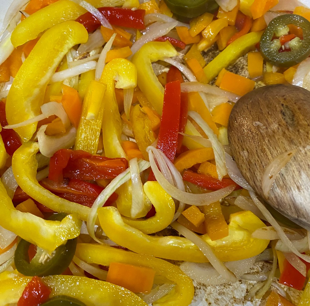 Add the peppers and jalapeños then fry for 10 mins until the peppers are soft. Add the paprika and cayenne pepper and cook for another minute.