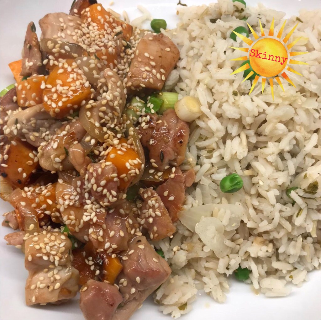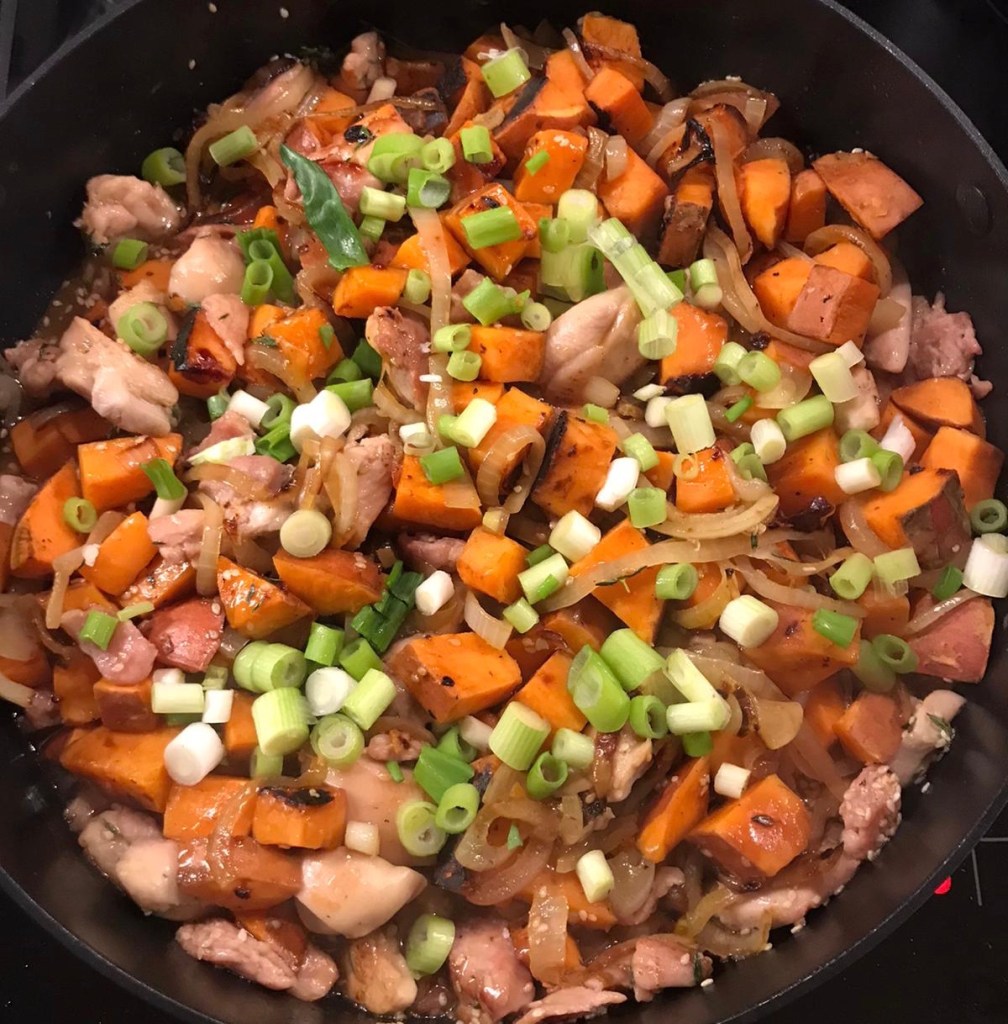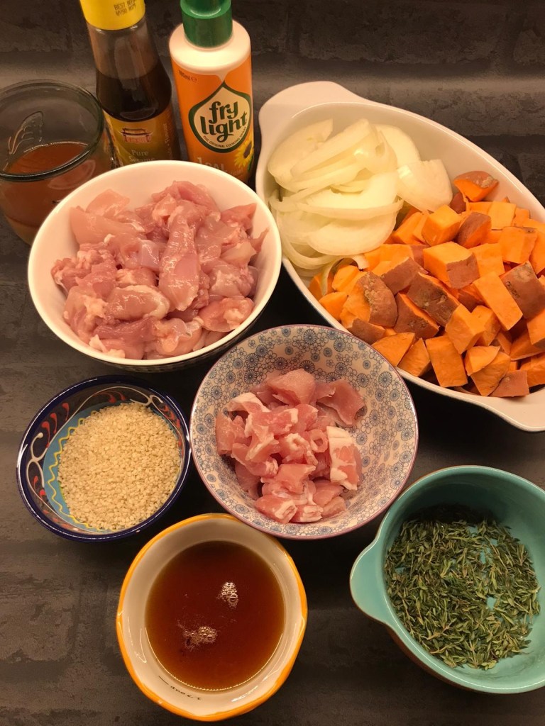 Juicy chunks of chicken, lean bacon, onions, and sweet potato, all quickly cooked in a sweet and salty, sticky sauce and garnished with sesame seeds and spring onions. Delicious served with rice or noodles. A very quick mid – week dinner, or perfect for a Friday Fake-Away I am sure the whole family will enjoy.