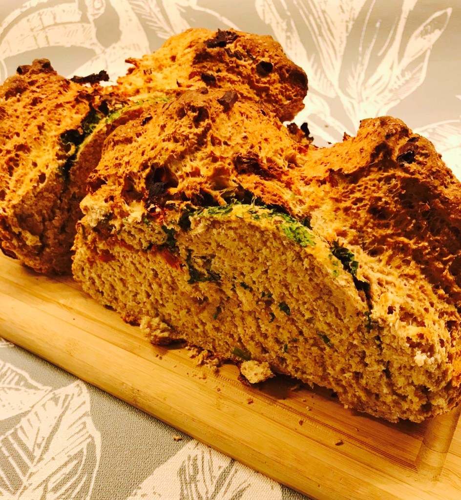 This delicious quick tasty and colourful festive soda bread is fantastic over the holiday time, enjoy with soup, cheeses and pickles, or leftover cold meat and salad, a very versatile loaf to have around.