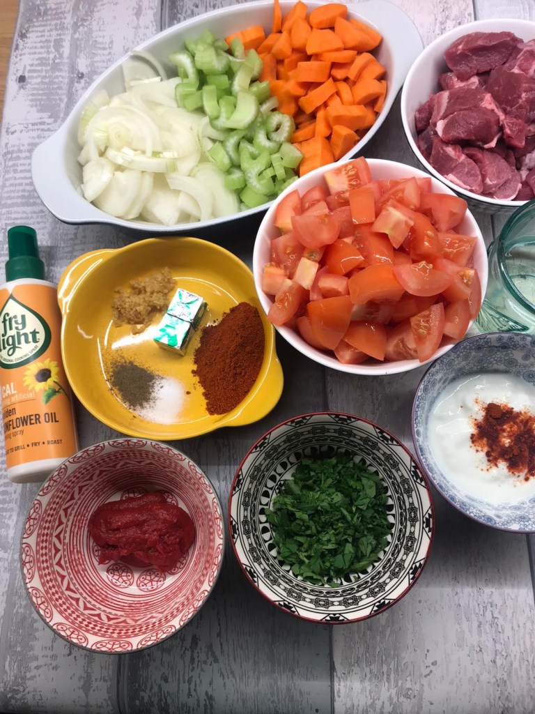 Heat a large non – stick lidded frying pan, spray with the low – calorie cooking spray. Add the lamb a handful at a time, cook over a high heat to seal and brown the meat. Remove from the pan and place on a plate.
