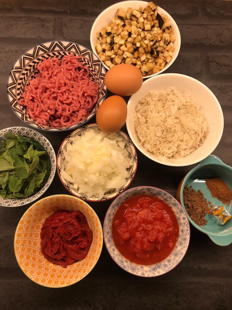 Put the onion and aubergine in a large bowl with the rice, tomato puree, stock cube, parsley, spices and lamb.