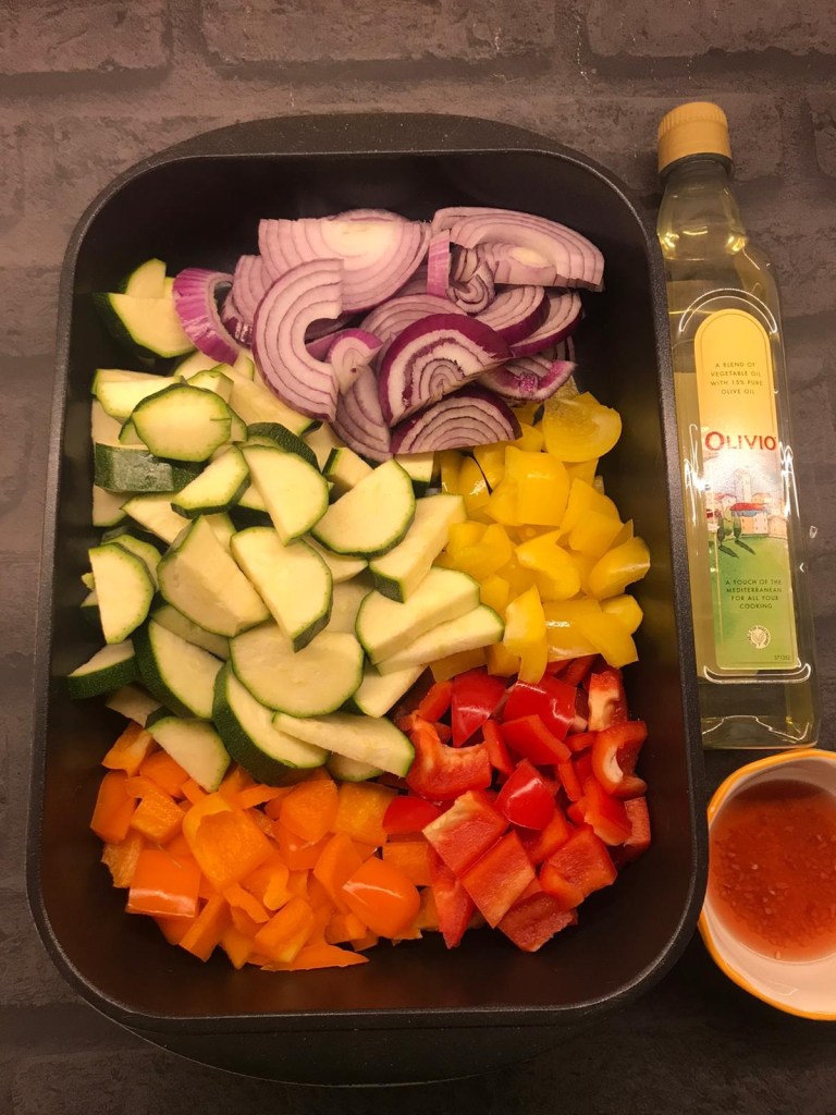 Once the meatloaf has been cooking for 1 hour, tip the peppers, courgettes and red onions into a roasting tin and toss with the oil. Roast in the oven with the meatloaf for 40 minutes until the vegetables are tender and a little charred.