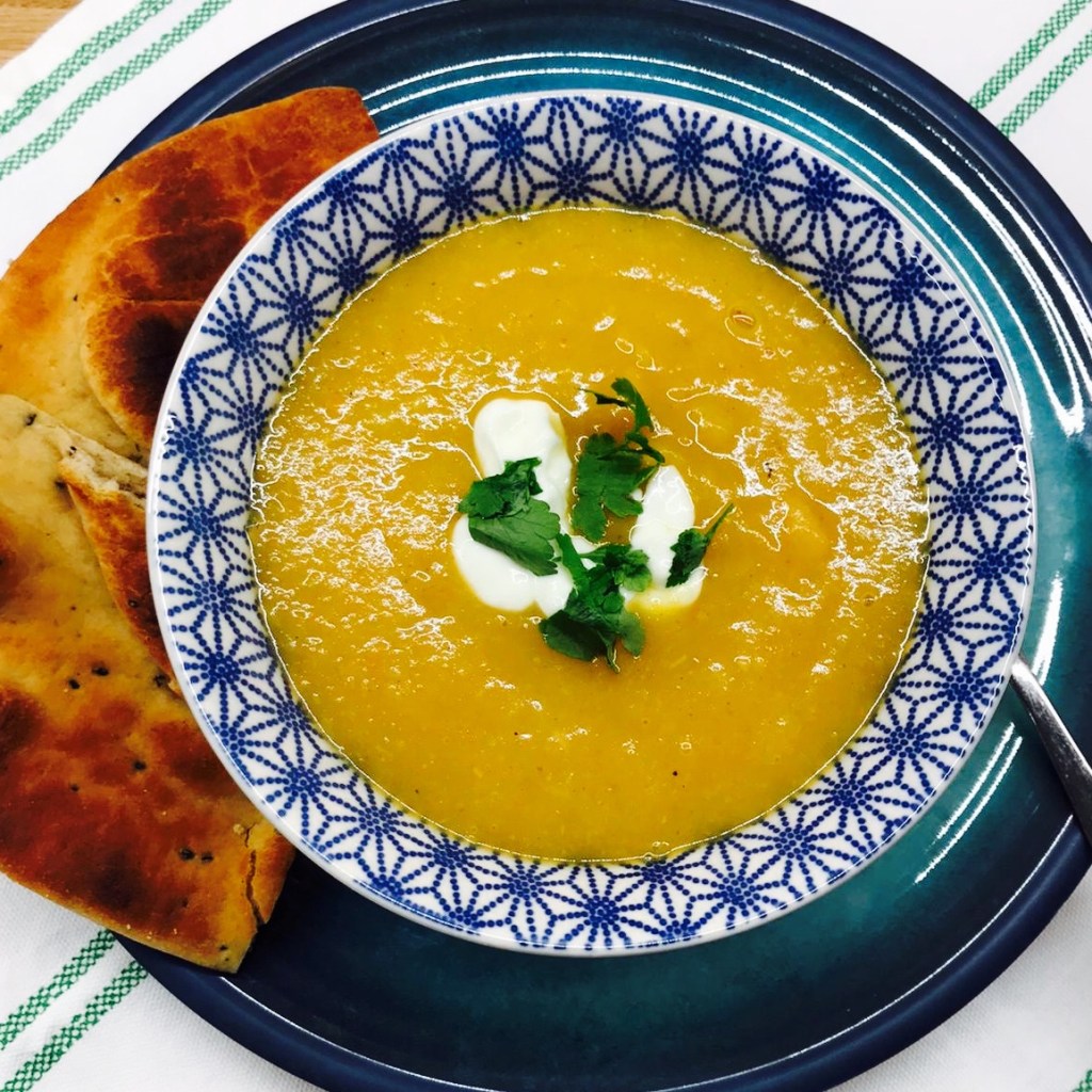 Serve garnish with a dollop of natural yogurt, a sprinkle of fresh coriander and a piece of toasted naan bread.